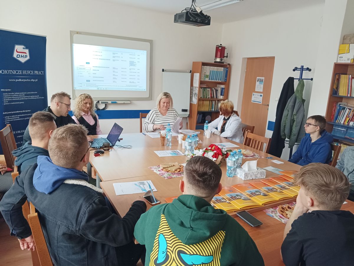 Frekwencja na spotkaniu dopisała. Młodzież skorzystała z usług doradczyni zawodowej Mobilnego Centrum Informacji Zawodowej, która przedstawiła nowe trendy w sporządzaniu dokumentów aplikacyjnych. Pośrednik pracy przedstawił aktualne oferty pracy i zapoznał młodzież ze specyfiką lokalnego rynku pracy. Specjalistka ds. szkoleń przedstawiła ofertę kursów zawodowych, które w bieżącym roku będą realizowane przez rzeszowski CEiPM. Dodatkowo omówiła warunki rekrutacji do II tury projektu „Odpowiedzialni za przyszłość”.
