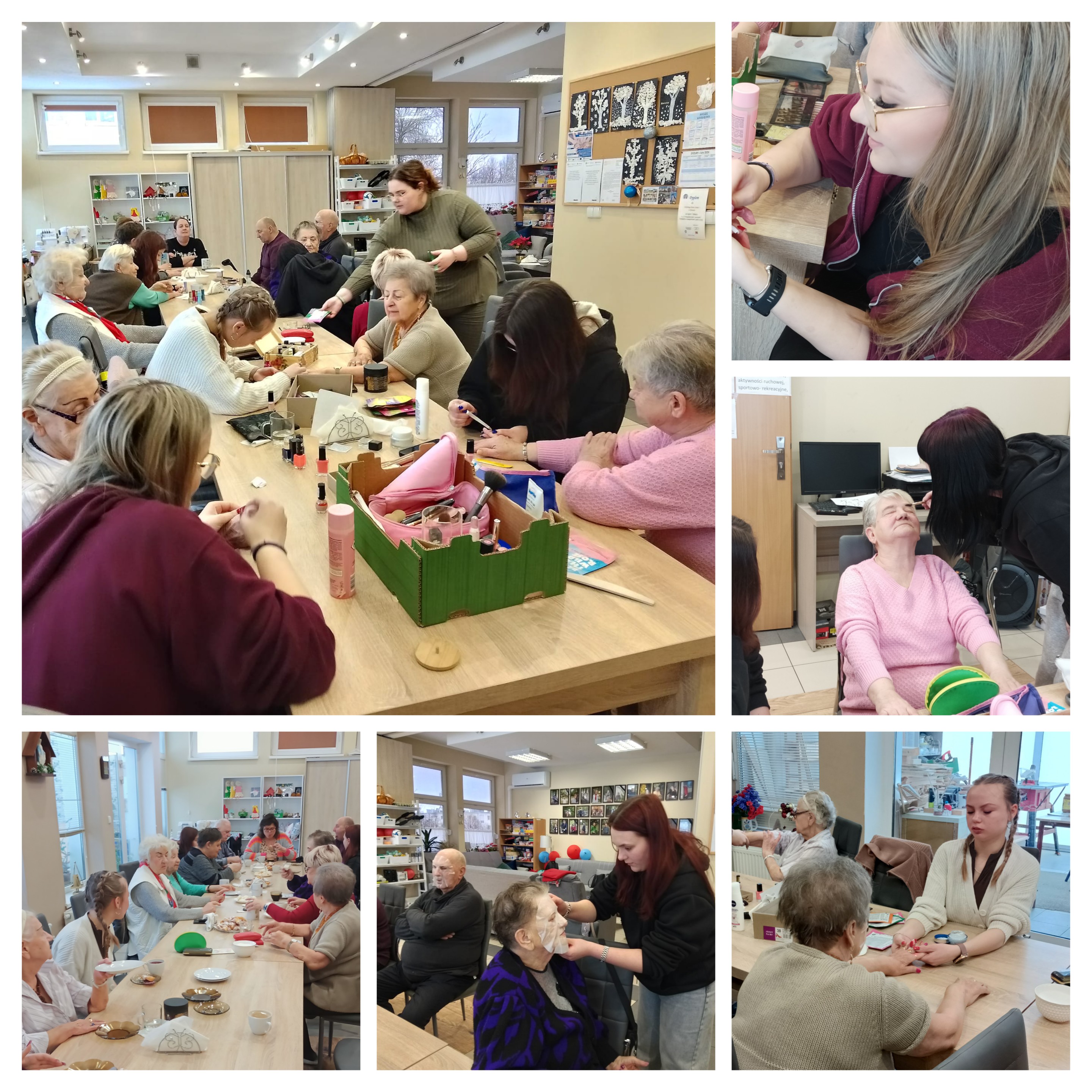 Wydarzenie było nie tylko okazją do pielęgnacji, ale przede wszystkim do budowania relacji międzypokoleniowych. Seniorzy mogli poczuć się docenieni i zauważeni, a wspólnie spędzony czas pozytywnie wpłynął na ich samopoczucie. Dla młodzieży było to cenne doświadczenie, uczące empatii, cierpliwości i wrażliwości na potrzeby innych. Humory wszystkim dopisywały, a zadowolone twarze pań, którymi zajmowali się nasi uczestnicy, to dowód na to, jak wiele radości dają takie spotkania. Gdy już buteleczki z kosmetykami, pędzle oraz inne akcesoria zostały schowane przyszedł czas na to, by zasiąść do stołu przy aromatycznej herbacie, kawie i przepysznych babcinych domowych wypiekach: chruścikach i bezach.