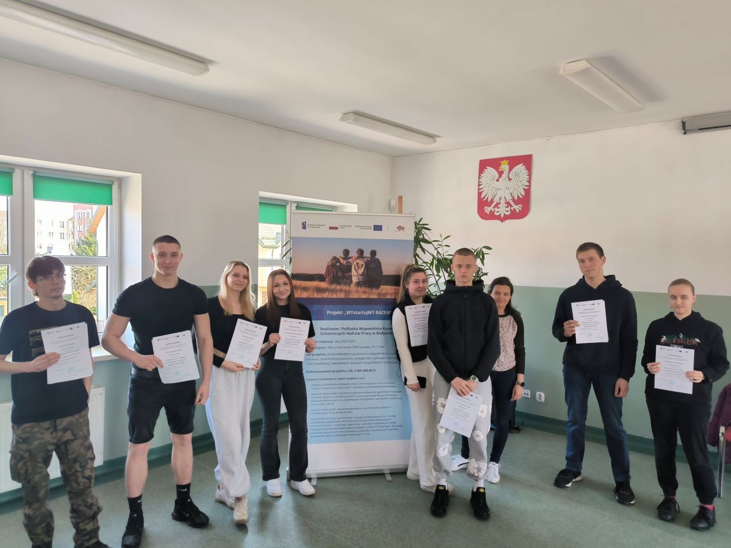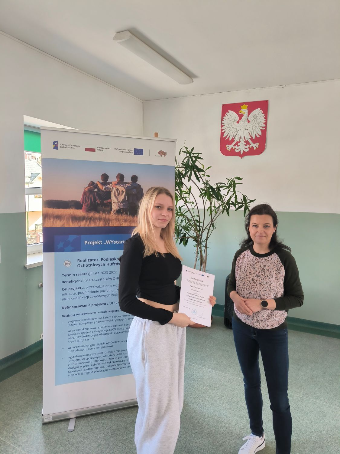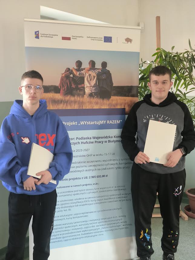 Projekt „WYstartujMY RAZEM” III Edycja jest współfinansowany ze Środków Europejskiego Funduszu Społecznego Plus w ramach programu Fundusze Europejskie dla Podlaskiego 2021-2027, Priorytetu VII Fundusze na rzecz zatrudnienia i kształcenia osób dorosłych Działania 7.5 Wspieranie zatrudnienia w regionie.