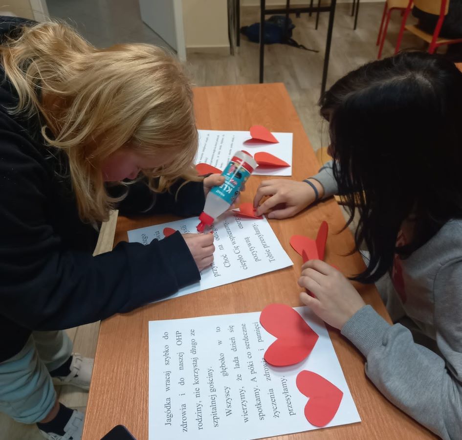 W OSiW odbyło się wiele inicjatyw realizowanych szczególnie podczas zajęć grupowych. Powstały przepiękne serca wykonane różnymi metodami plastycznymi. Są one wyrazem tego, jak bardzo Jagoda jest dla nas ważna i jak mocno otulamy ją miłością koleżeńską, wypływającą z naszych serc. Rozwinęła się również twórczość poetycka przelana na papier wierszem oraz laurki z najpiękniejszymi słowami wsparcia: „Jagoda kochamy Cię”, którym towarzyszyły czerwone serduszka, symbol miejsca z którego wypływa nasza ogromna chęć wspierania w trudnych chwilach.