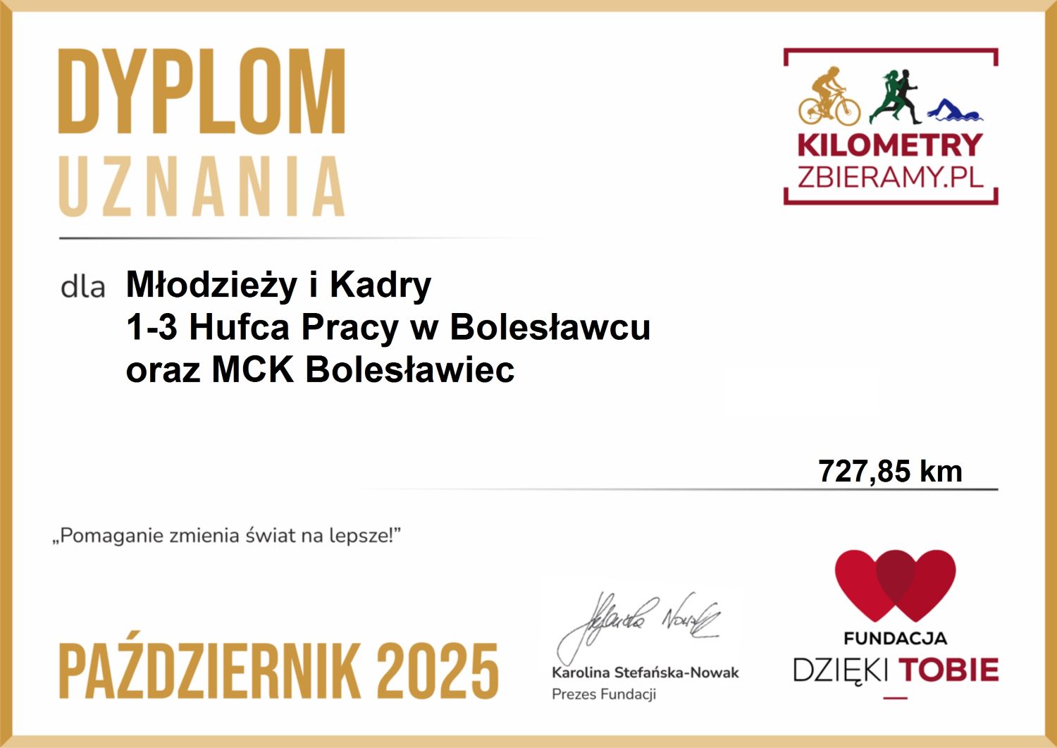 W październiku młodzież wraz z wychowawcami 1-3 HP oraz kadrą MCK Bolesławiec zebrała 727,85 km i otrzymała dyplom uznania, a do projektu dołączyliśmy dopiero pod koniec miesiąca. Uczestnicy hufca codziennie pokonują kilometry – spacerując, biegając, jeżdżąc rowerem.