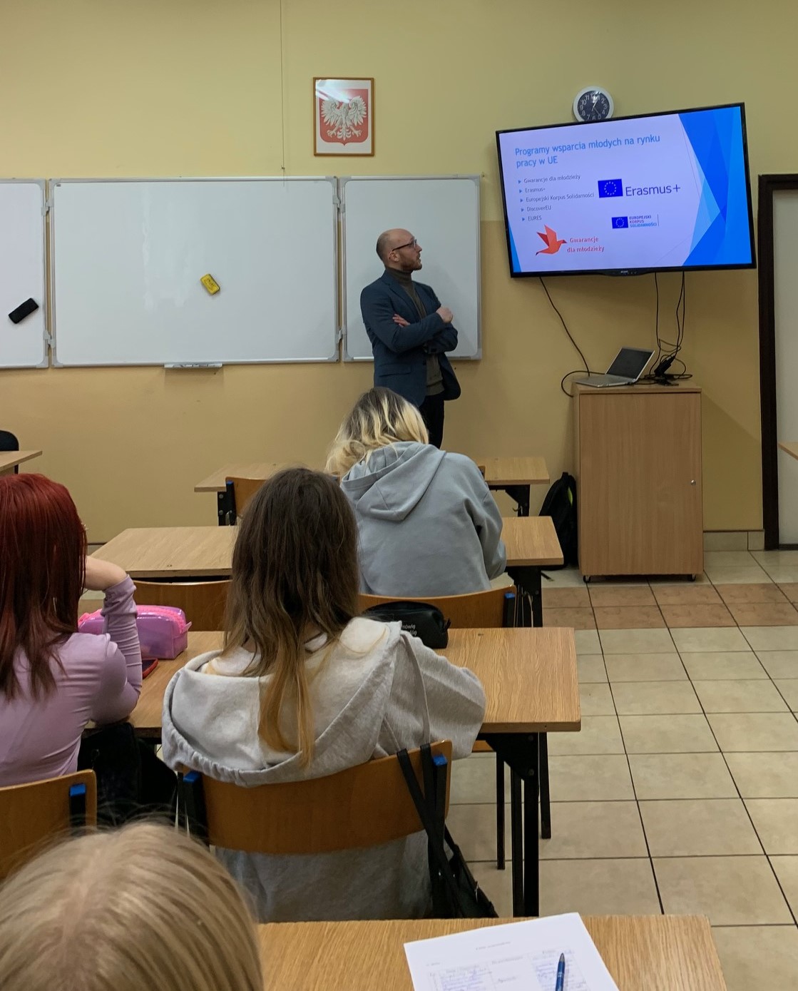 Uczestnicy Hufca Pracy w Zambrowie z kl. III i I BS mieli możliwość zapoznać się z polityką europejską, która stanowi jeden z przedmiotów rozmów w EKES. Podczas spotkania prowadzący przedstawił programy wsparcia młodych na rynku pracy w UE takie jak: Gwarancje dla młodzieży, ERASMUS+, Eures, Europejski Korpus Solidarności, które to m.in. realizują bądź realizowały Ochotnicze Hufca Pracy oraz główne postulaty EKES – rynek pracy i edukacja.