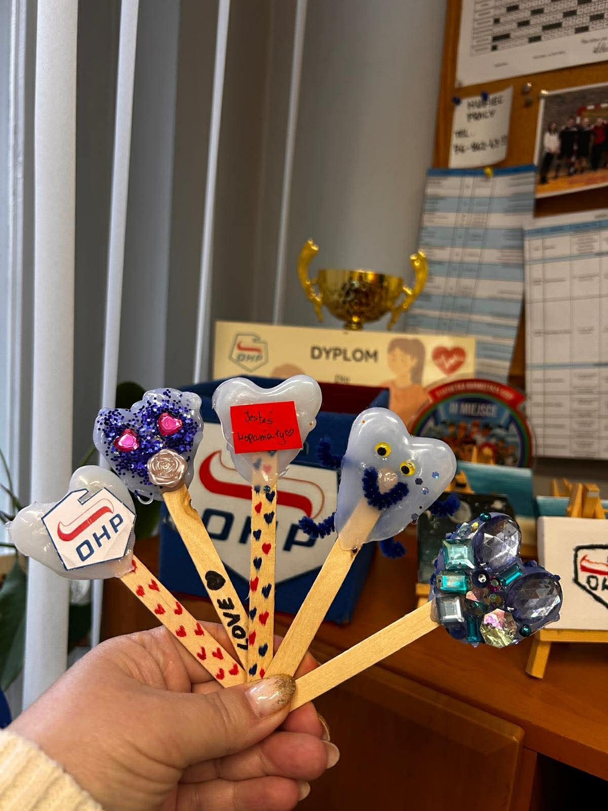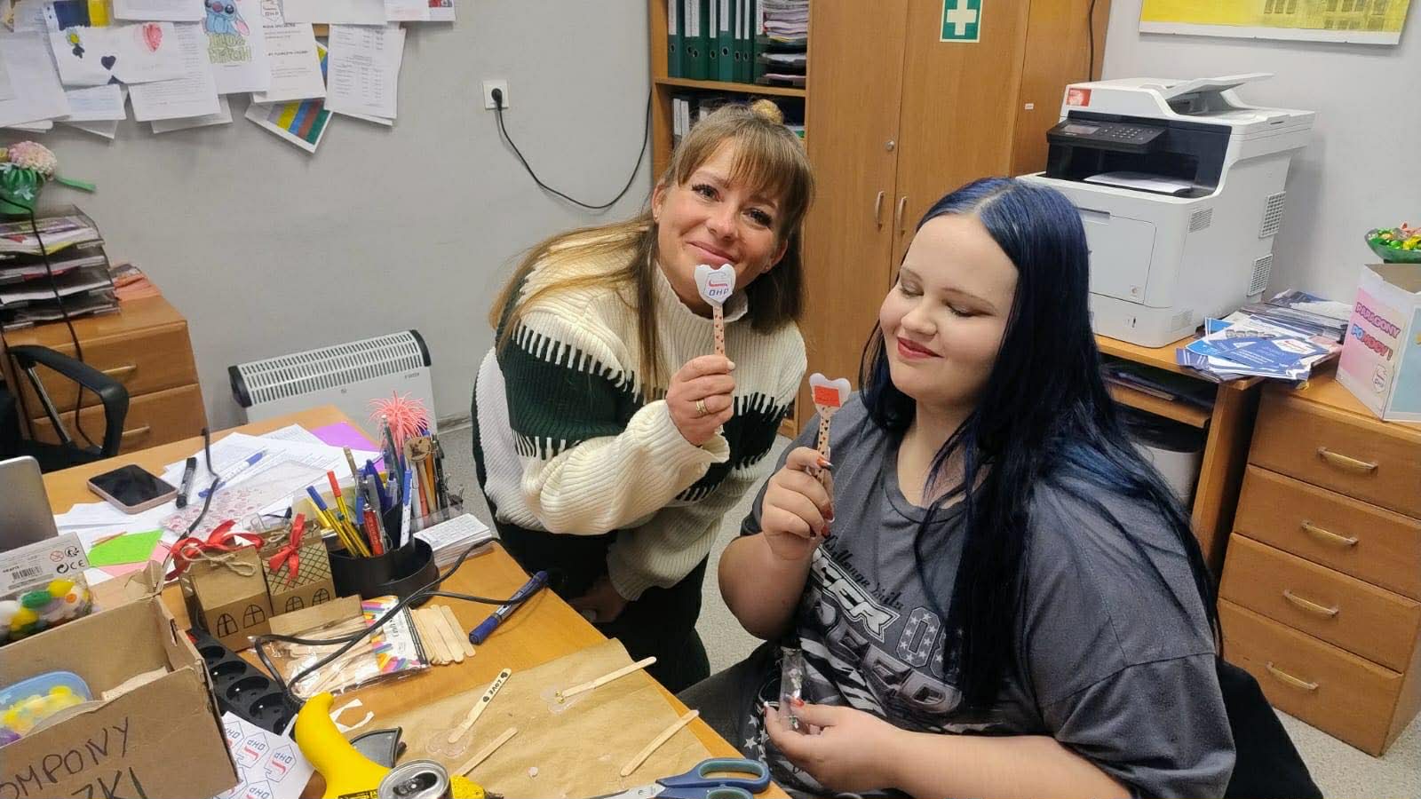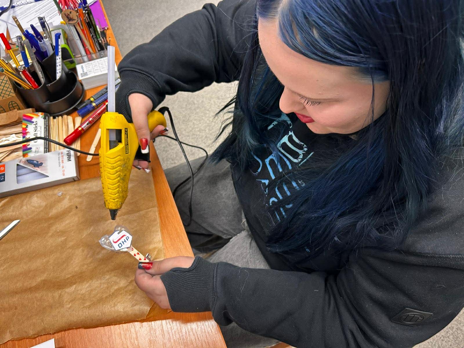 Podczas pierwszej części warsztatów młodzież tworzyła dekoracyjne serca z wykorzystaniem kleju na gorąco. Uczestnicy samodzielnie projektowali wzory, a następnie krok po kroku budowali przestrzenne formy. Gotowe prace zostały ozdobione brokatem, koralikami oraz farbami, co nadało im wyjątkowy charakter. Zajęcia wymagały precyzji i cierpliwości, ale jednocześnie dawały dużo satysfakcji i radości z własnoręcznie wykonanych ozdób.