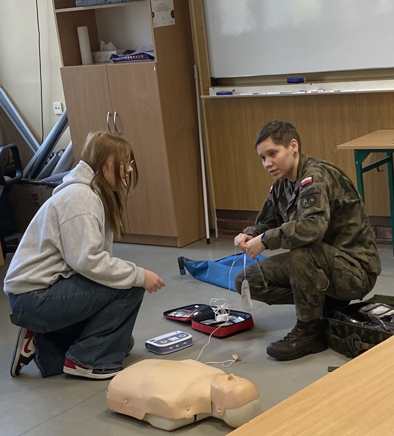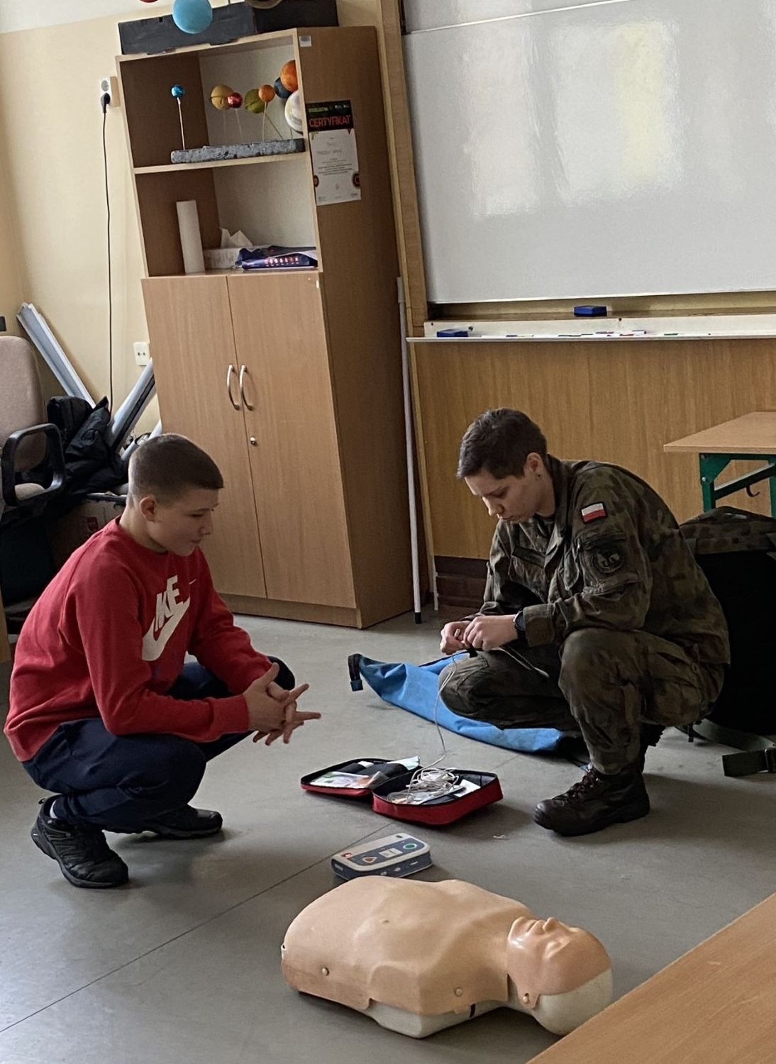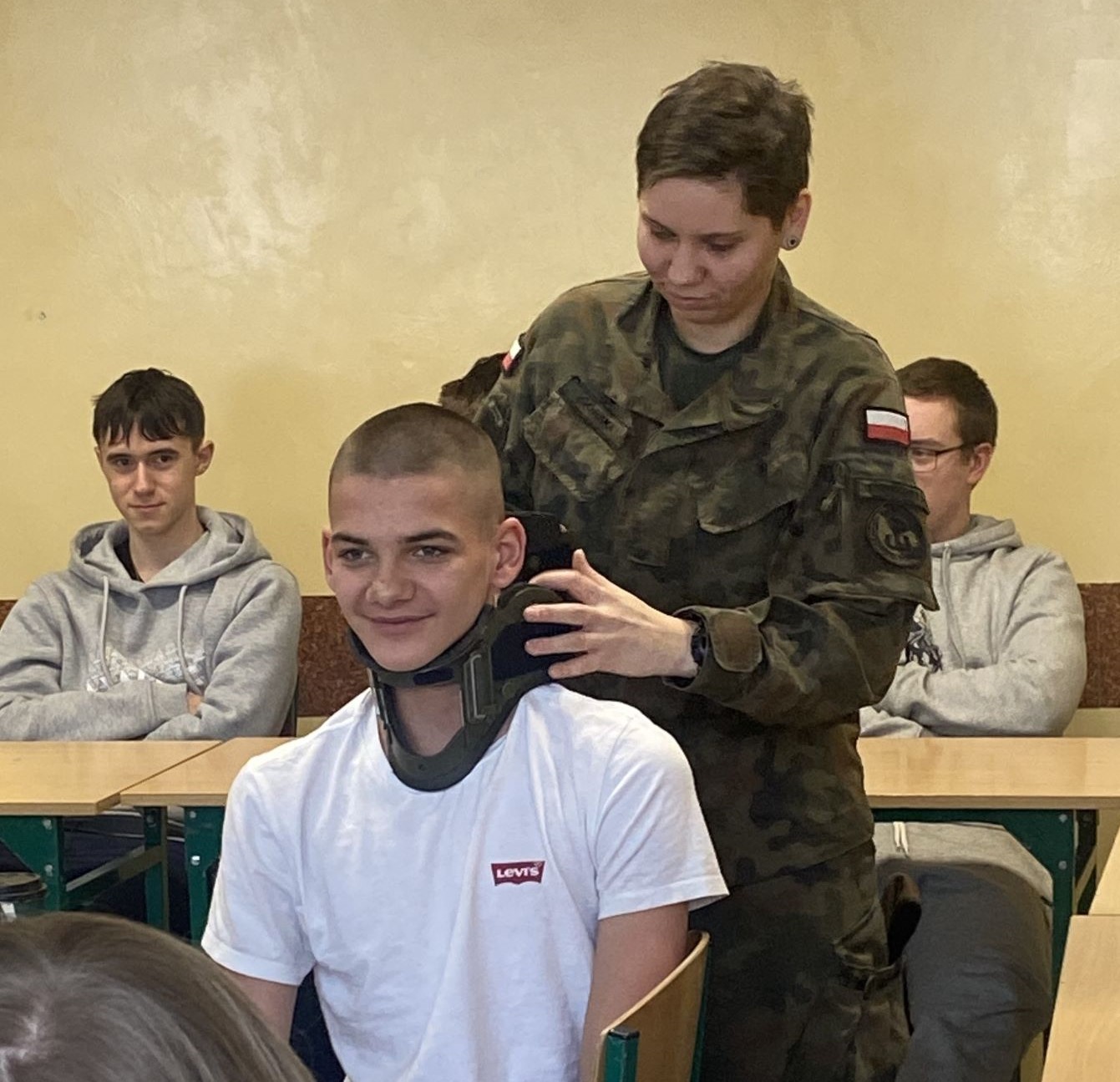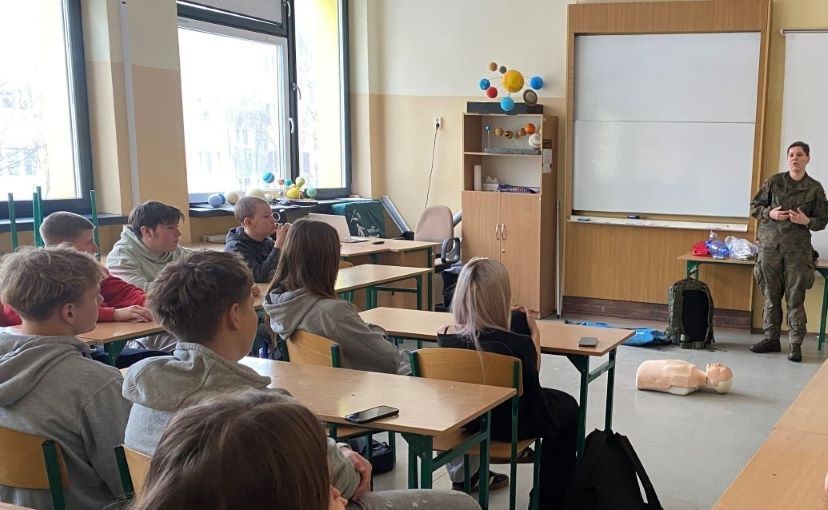 W zajęciach udział wzięli uczestnicy 1-23 HP Polkowice z I rocznika, którzy mieli okazję poszerzyć swoją wiedzę oraz umiejętności w zakresie ratowania życia i zdrowia. Szkolenie zostało zorganizowane przez 1-23 HP Polkowice przy współpracy z 162 Batalionem Lekkiej Piechoty w Głogowie, natomiast zajęcia poprowadziła szeregowa Daria – żołnierka Wojsk Obrony Terytorialnej. Celem spotkania było podniesienie poziomu wiedzy młodzieży z zakresu udzielania pierwszej pomocy, zasad bezpieczeństwa podczas jej wykonywania oraz uświadomienie, jak ogromne znaczenie ma szybka i właściwa reakcja w sytuacjach zagrożenia życia lub zdrowia. Uczestnicy zapoznali się z podstawowymi zasadami pierwszej pomocy, w tym z prawnymi aspektami jej udzielania. Młodzież dowiedziała się, że zadaniem osoby udzielającej pierwszej pomocy jest przede wszystkim utrzymanie poszkodowanego przy życiu oraz niedopuszczenie do powstania dalszych powikłań do czasu przybycia zespołu ratownictwa medycznego. Instruktorka podkreślała, jak istotne jest przełamanie strachu i bierności oraz szybkie sprawdzenie, czy poszkodowany oddycha. Zwrócono również uwagę na fakt, że każda sekunda podczas udzielania pierwszej pomocy ma ogromne znaczenie. Istotnym elementem zajęć był również pokaz prawidłowego zakładania kołnierza ortopedycznego, podczas którego uczestnicy 1-23 HP Polkowice ćwiczyli pod okiem szeregowej Darii, żołnierki Wojsk Obrony Terytorialnej. Szkolenie spotkało się z dużym zainteresowaniem i pozytywnym odbiorem ze strony młodzieży. Uczestnicy byli pod wrażeniem profesjonalizmu oraz doświadczenia prowadzącej, a także praktycznego charakteru zajęć. Takie inicjatywy nie tylko zwiększają wiedzę, ale również kształtują postawy odpowiedzialności i gotowości do niesienia pomocy innym – bo każdy z nas może w każdej chwili znaleźć się w sytuacji, w której pomoc będzie niezbędna.