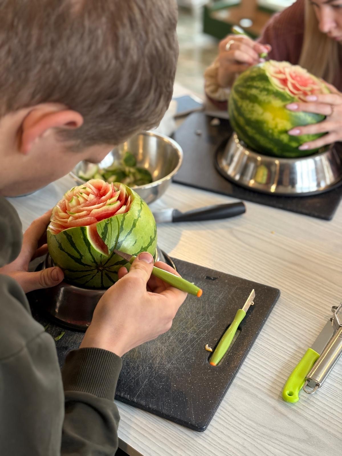 Choć szkolenie skupiało się na podstawach carvingu, ważne było także pokazanie, że kreatywność może stać się pomysłem na biznes. Młodzież zobaczyła, gdzie wykorzystuje się takie dekoracje – od wesel po firmowe eventy – i jak rośnie zapotrzebowanie na osoby, które potrafią je tworzyć.